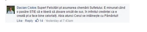 ”Super! Felicitări pt asumarea chemării Sufletului. E minunat când o pasăre STIE că e liberă să zboare oricât de sus, în infinitul credinţei ca e creată pt a face bine celorlalţi. Abia atunci Cerul se intâlneşte cu Pământul!”
