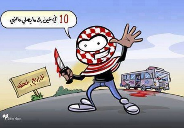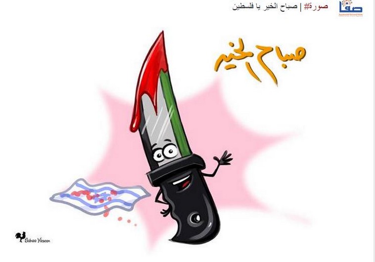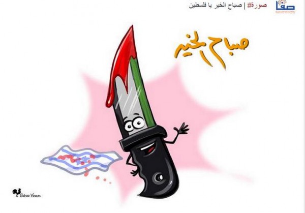 Un alt desen, al aceluiași Yassen a fost publicat de agenția palestiniană Shehab, și înfățișează un cuțit însângerat în culorile Palestinei, care zâmbește. Lângă el, scrie în arabă: „Bună dimineața Palestina!” Atacul a avut loc la ora 7 dimineața.