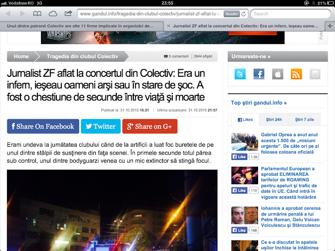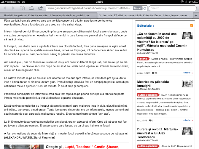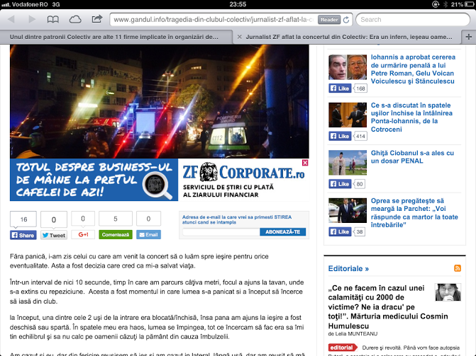 Nu vreau sa ma dau desteptul desteptilor, dar inainte de a a-l vedea si auzi pe R.M. la B1 Tv remarcasem deja niste ciudatenii in desfasurarea tragediei. De meserie sunt .proiectant, am intocmit documentatii tehnice cu scenarii de evacuare in caz de incendii in vederea obtinerii avizului de la Pompieri (mai nou ISU) deci am cat de cat idee de ce inseamna o evacuare in caz de incendiu, dar la cum au decurs acolo lucrurile, CEVA NU SE LEAGA