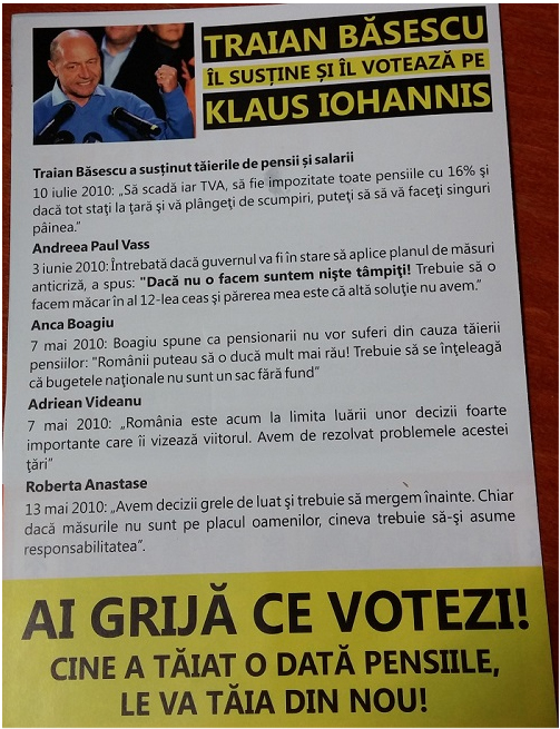 Pensionarii au început să primească acasă alături de talonul de pensie fluturași de propagandă electorală întocmită de echipa lui Victor Ponta, care îl vizează pe cel mai periculos contracandidat al său (conform sondajelor), Klaus Iohannis, scrie reportervirtual.ro pe Pagina de Politică.