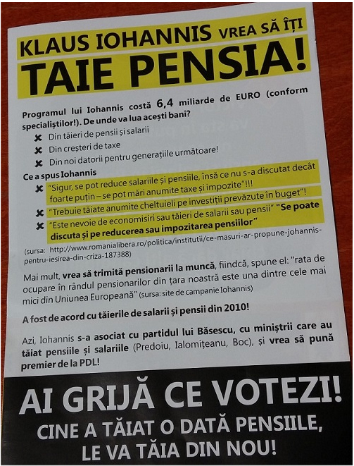 Pensionarii au început să primească acasă alături de talonul de pensie fluturași de propagandă electorală întocmită de echipa lui Victor Ponta, care îl vizează pe cel mai periculos contracandidat al său (conform sondajelor), Klaus Iohannis, scrie reportervirtual.ro pe Pagina de Politică.