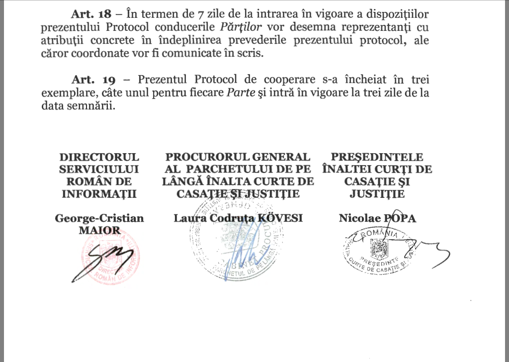 Singurele semnaturi valabile pe acest Protocol Secret apartin lui Maior-SRI si Kovesi, pe atunci Procuror General al Romaniei dar de fapt „prizoniera” din sufrageria lui Oprea a cuplului Maior-Coldea !!! Kovesi nu a avut de ales…