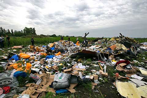 Joi după amiază, pentru câteva zeci de se­cunde, în apropierea satului Grabovo, în­tr-o zonă minieră a bazinului Donbass, din cer au căzut nu doar bucăți de avion, tot felul de bagaje, ci și oa­meni. Unii erau încă legați de scaunele avionului. Alții pur și simplu parcă zburau prin aer. Unele trupuri au ajuns departe pe câmp, în la­nuri de floarea soarelui sau de porumb. Altele s-au prăbușit cu zgomot pe ga­raje, pe cărările asfaltate din­tre blocuri sau au căzut pe câte o casă, spărgând aco­perișul. Zona în care s-au răspândit res­turile avionului și trupurile pasagerilor are un diametru de 32 km. La aproape pa­tru zile de la producerea tragediei, până luni la prânz, au fost adunate peste 250 de cadavre, iar alte 60 de fragmente umane (unele aflate în descompunere, altele mân­cate de animale sălbatice) au fost strânse și depozitate în vagoanele frigorifice ale unui tren garat în stația de cale ferată Torez, din apropiere. Liderii separatiști ca­re controlează operațiunea au anunțat că abia după sosirea experților internaționali trenul se va putea pune în mișcare și va transporta resturile umane la Harkov, un­de s-ar fi pregătit condiții pentru ca fami­liile sau apropiații victimelor catastrofei aviatice să poată parcurge procedura de identificare a cadavrelor.