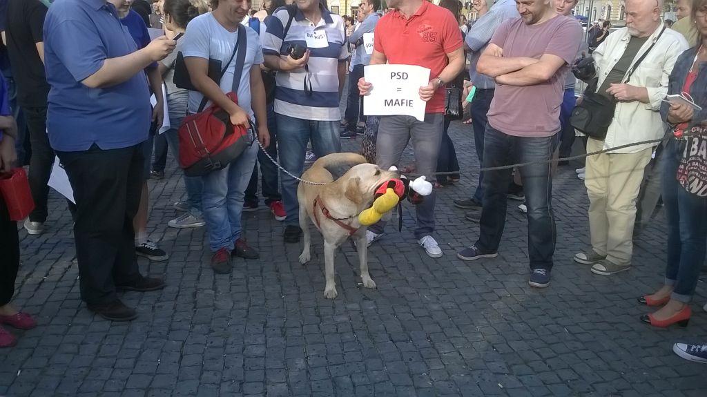 O păpușă Mickey Mouse, adusă la protestul de la Cluj pe post de Victor Ponta, a fost înhățată de un câine, spre deliciul manifestanților. ”Nu-l lăsa!”, ”Ăla e Ponta și câinele e Iohannis”, ”Ba, e DNA”, ”Nu, e Laura”, ”Papă-l pe Ponta!” s-au distrat cei care au participat la protest. Încurajat, cățelul l-a smotocit cum trebuie pe Mickey Mouse ”Ponta” și nu a mai vrut să-i dea drumul din gură.