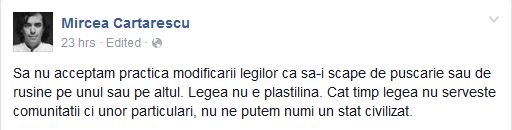 “Să nu acceptăm practica modificării legilor ca să-i scape de pușcărie sau de rușine pe unul sau pe altul. Legea nu e plastilină. Cât timp legea nu servește comunității ci unor particulari, nu ne putem numi un stat civilizat.”, consideră Cărtărescu.