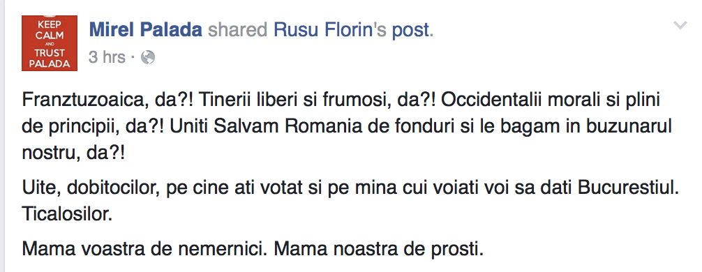 „Franztuzoaica, da?! Tinerii liberi si frumosi, da?! Occidentalii morali si plini de principii, da?! Uniti Salvam Romania de fonduri si le bagam in buzunarul nostru, da?! Uite, dobitocilor, pe cine ati votat si pe mina cui voiati voi sa dati Bucurestiul. Ticalosilor. Mama voastra de nemernici. Mama noastra de prosti”, a scris Palada.