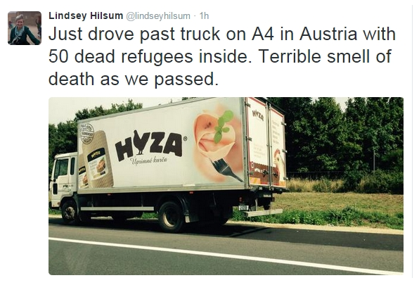 truck0„Tocmai am trecut pe lângă camionul cu 50 de cadavre de refugiaţi de pe A4. Mirosul groaznic al morţii ne-a însoţit”, a scris pe Twitter Lindsay Hilsum, corespondentul postului britanic Channel 4, care a ajuns la locul dramei din Austria.