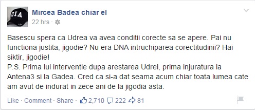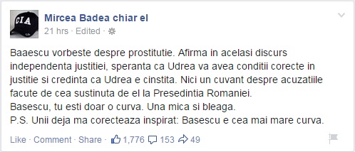 P.S. Unii deja mă corectează inspirat: Băsescu e cea mai mare curvă”, a scris Mircea Badea pe Facebook.