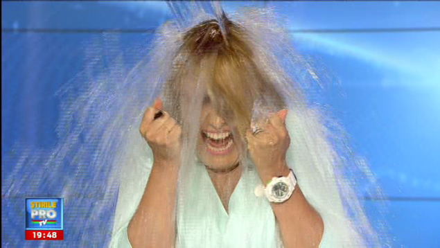Totul a avut loc in direct, la finalul jurnalului de stiri de la PRO TV. „Hai!”, a fost indemnul ei catre colegul care se afla langa ea cu galeata plina.