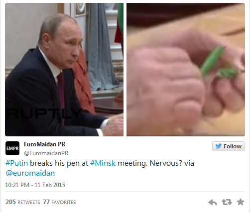 Daca la inceputul negocierilor Vladimir Putin a parut relaxat si mai mereu cu zambetul pe buze, pe parcursul discutiilor lucrurile par sa se fi tensionat, presedintele rus fiind surprins de un fotograt in timp ce rupea un creion.