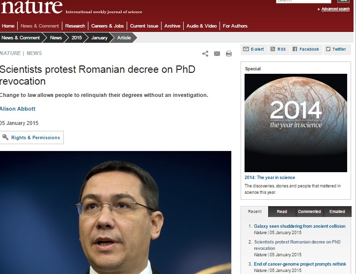 ”Oameni de știință români au reacționat furioși la decretul (ordonanța – n.r.) “de urgență” guvernamentală emisă de prim-ministrul Victor Ponta, care permite renunțarea la gradul (titlul – n.r.) de doctor, prin Ministerul Educației, fără nicio explicație. Anterior, la fel ca în majoritatea țărilor, un doctorat în România putea fi revocat numai după o anchetă”, titrează cunoscuta revistă de știință Nature, într-un articol publicat luni pe site-ul său și semnat de Alison Abbott.