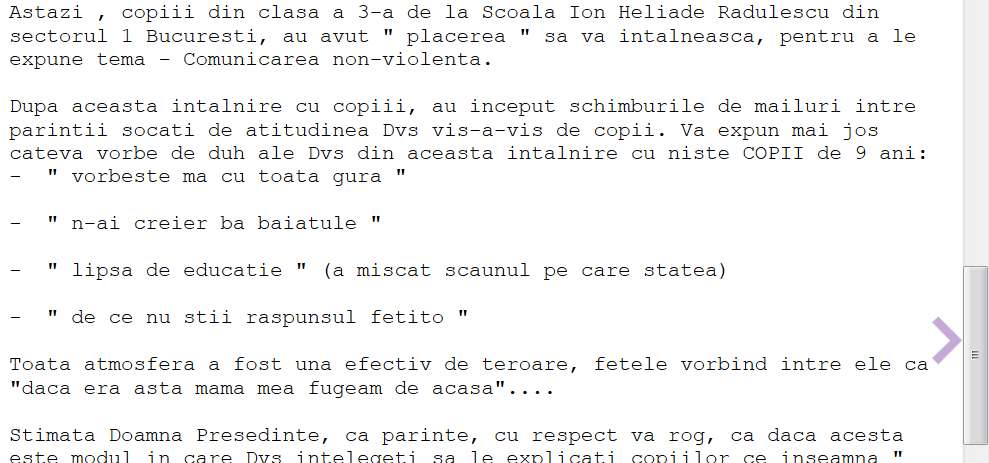 Prin ceea ce faceți voi de când ați venit în clasă. Toți ați practicat genul ăsta: fie agresor, fie victimă. De când ați intrat în clasă, prin glumițele astea, prin chipropourile astea, prin râsete, prin vorbit peste se cheamă violență emoțională. Fiecare dintre voi are de arătat unuia că e mai deștept decât el și altuia că e mai prost decât el. Din cauza asta, de când ați intrat în clasă, toți cu toți aveți câte ceva de împărțit. De-aia și viermuiala asta. De-aia nu ești în stare să taci din gură, Bogdane! De-aia nu sunteți în stare să vă uitați la un filmuleț de trei minute, să citiți textul, că tot timpul sunteți preocupați să-i arătați lu’ Nicolae că e mai prost decât voi și mai rău sau lu’ Bogdan că este mai deștept decât era cățelul vostru și chestii d-astea” (un copil șoptind uimit – ne comparăm cu cățelul?!). Așa, Dane, așa, că dacă nu te-ntorceai tu, nu știa Bogdan de care vorbesc. Calmați-vă! Principalii vinovați ai violenței sunteți voi!
