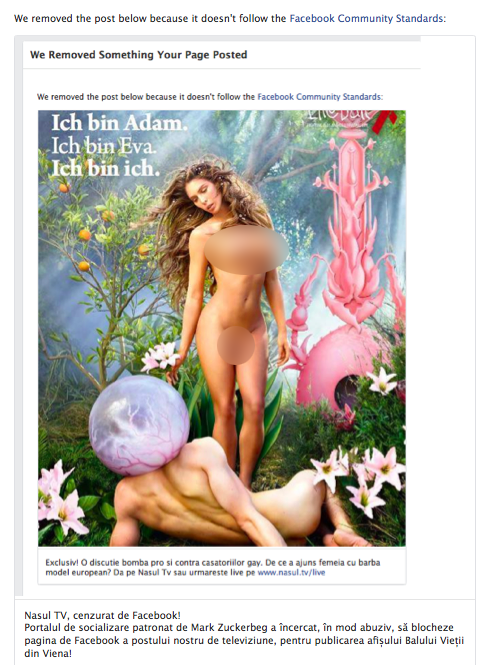 Screen Shot 2014-06-05 at 12.54.35UPDATE (13:00): Facebook recidivează! În urmă cu câteva minute, în urma unor reclamații primite de la „oameni de bine”, a înlăturat postarea publicată pe această pagină, în care Nașul TV semnala modul în care administratorii Facebook au șters, în mod abuziv, postarea articolului în care a fost publicat posterul care a scandalizat Austria. Mai mult, Facebook nu s-a limitat doar la ștergerea fotografiei, ci a eliminat și comentariile cititorilor, încălcându-le acestora libertatea de exprimare.