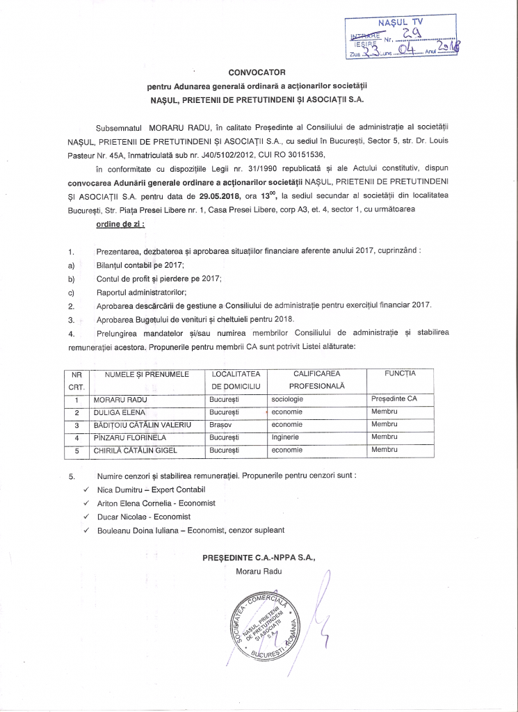 în conformitate cu dispozițiile Legii nr. 31/1990 republicată și ale Actului constitutiv, dispun convocarea Adunării generale ordinare a acționarilor societății NAȘUL, PRIETENII DE PRETUTINDENI ȘI ASOCIAȚII S.A. pentru data de 29.05.2018, ora 1300, la sediul secundar al societății din localitatea București, Str. Piața Presei Libere nr. 1, Casa Presei Libere, corp A3, et. 4, sector 1, cu următoarea