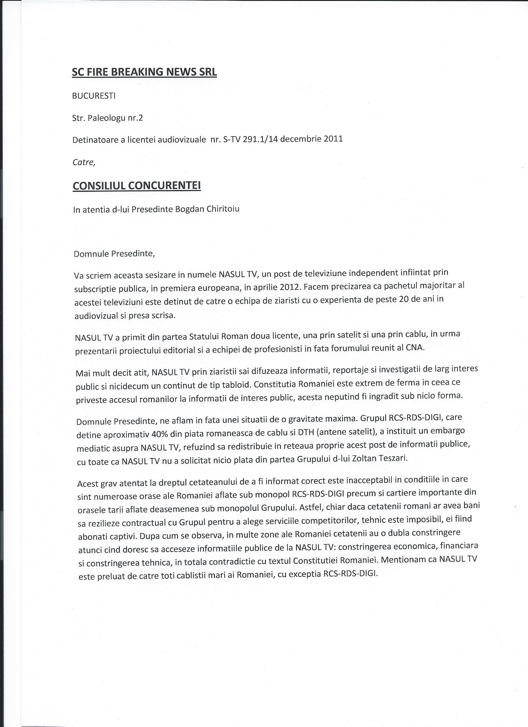 Miercuri, 13 iunie 2012, reprezentantii legali ai televiziunii NASUL TV au adresat un memoriu presedintelui Consiliului Concurentei, Bogdan Chiritoiu, prin care solicita implicarea autoritatilor statului intr-o problema care tine de libertatea presei si egalitatea de sanse pe piata media din Romania.