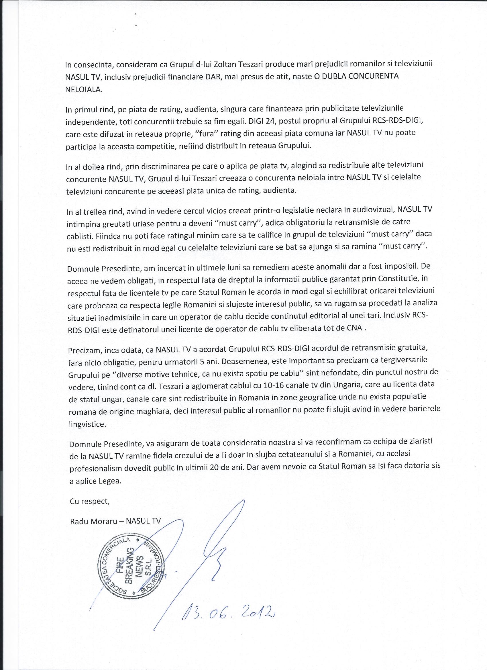 Domnule Presedinte, am incercat in ultimele luni sa remediem aceste anomalii dar a fost imposibil. De aceea ne vedem obligati, in respectul fata de dreptul la informatii publice garantat prin Constitutie, in respectul fata de licentele tv pe care Statul Roman le acorda in mod egal si echilibrat oricarei televiziuni care probeaza ca respecta legile Romaniei si slujeste interesul public, sa va rugam sa procedati la analiza situatiei inadmisibile in care un operator de cablu decide continutul editorial al unei tari. Inclusiv RCS-RDS-DIGI este detinatorul unei licente de operator de cablu tv eliberata tot de CNA .