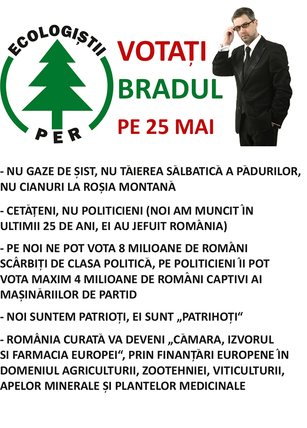 Ghinionul e ca bradutul pe care-l vedem este cam pricajit si n-o sa te prea tina, nu cred ca vei iesi invingator. Eu iti doresc succes, dar mai trebuie sa creasca cam mult acel bradut, ca sa-l vedem in forul legislativ european!… Mai trebuie udat cam mult, ii trebuie si mai multa lumina, ca-i greu cu atatea buruieni, chiar si mascate in trandafiri, lalele sau meri…