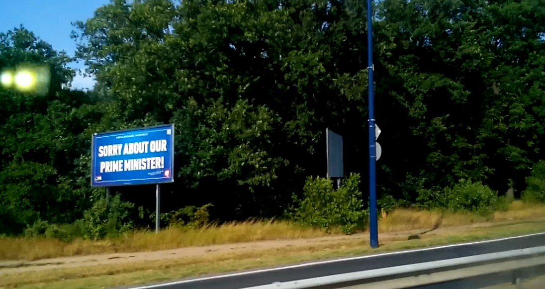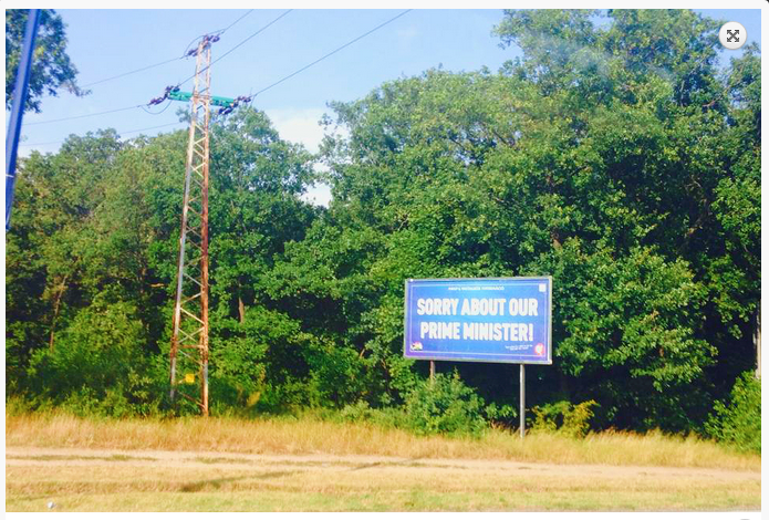 Mai multe panouri cu mesajul „Sorry about our prime minister” (Ne cerem scuze pentru premierul nostru – n.red.) au fost amplasate în apropierea capitalei Ungariei, Budapesta. Vizibile de pe drumurile principale care intră în Budapesta, panourile ironizează mesajele Guvernului condus de Viktor Orbán.