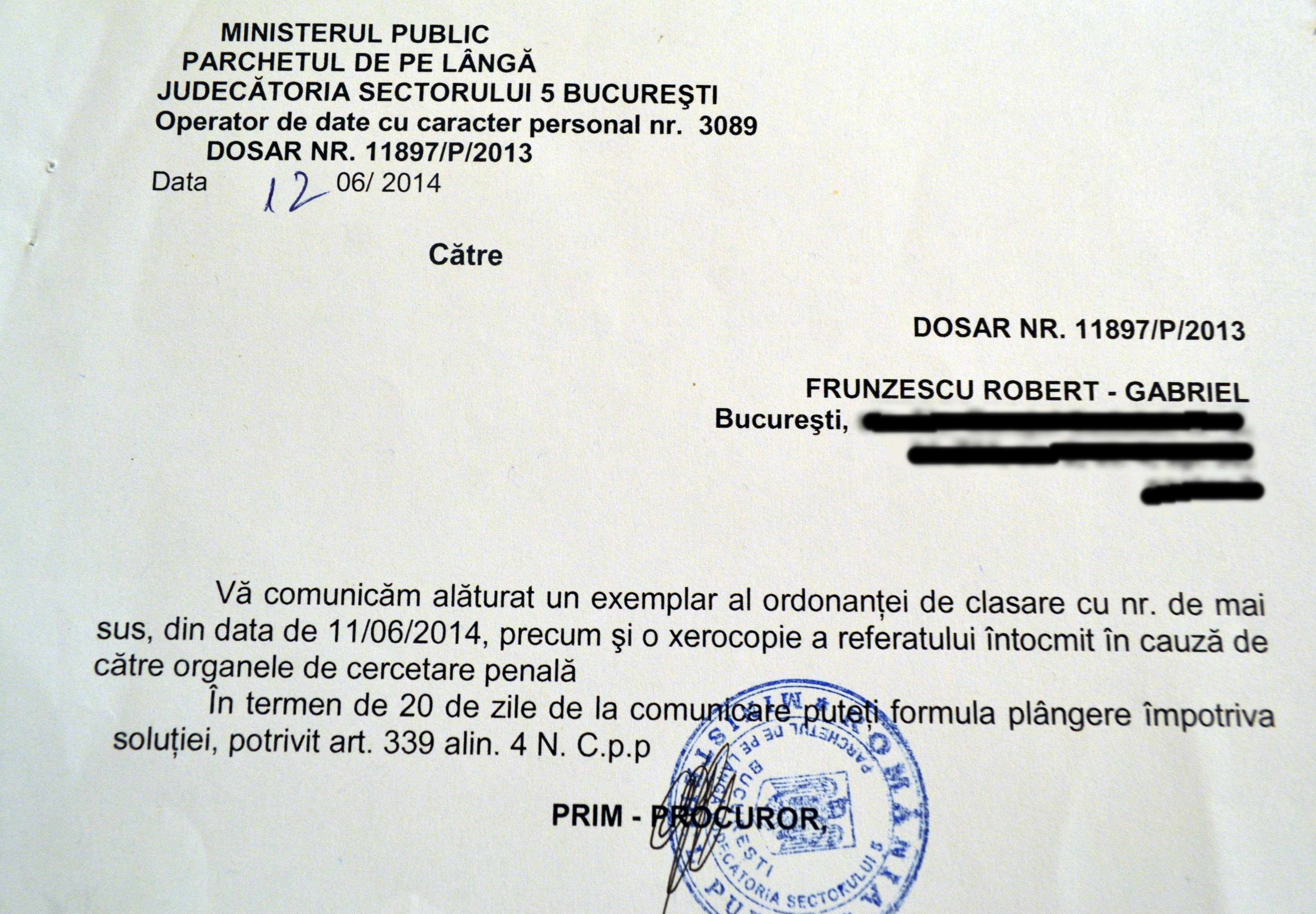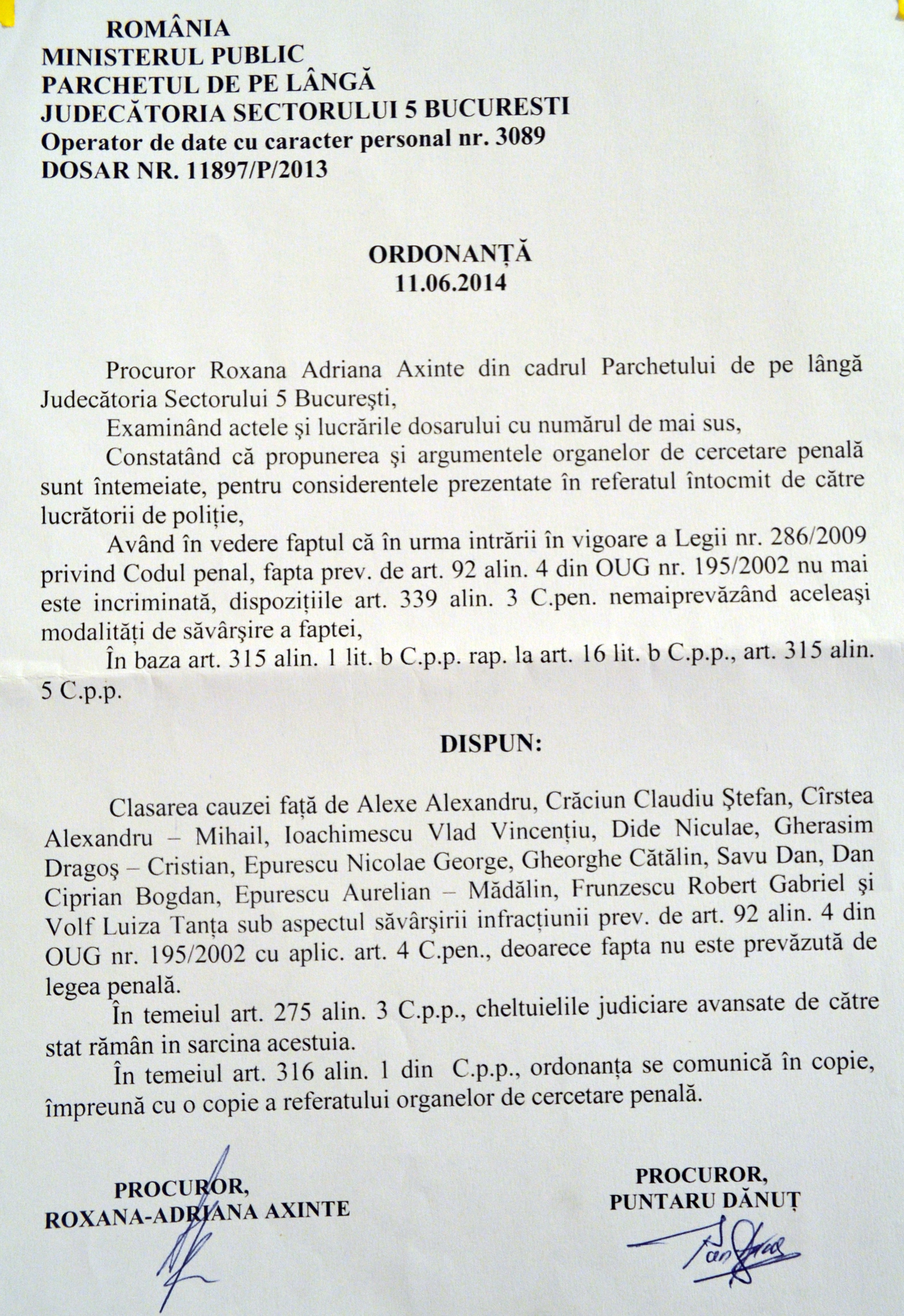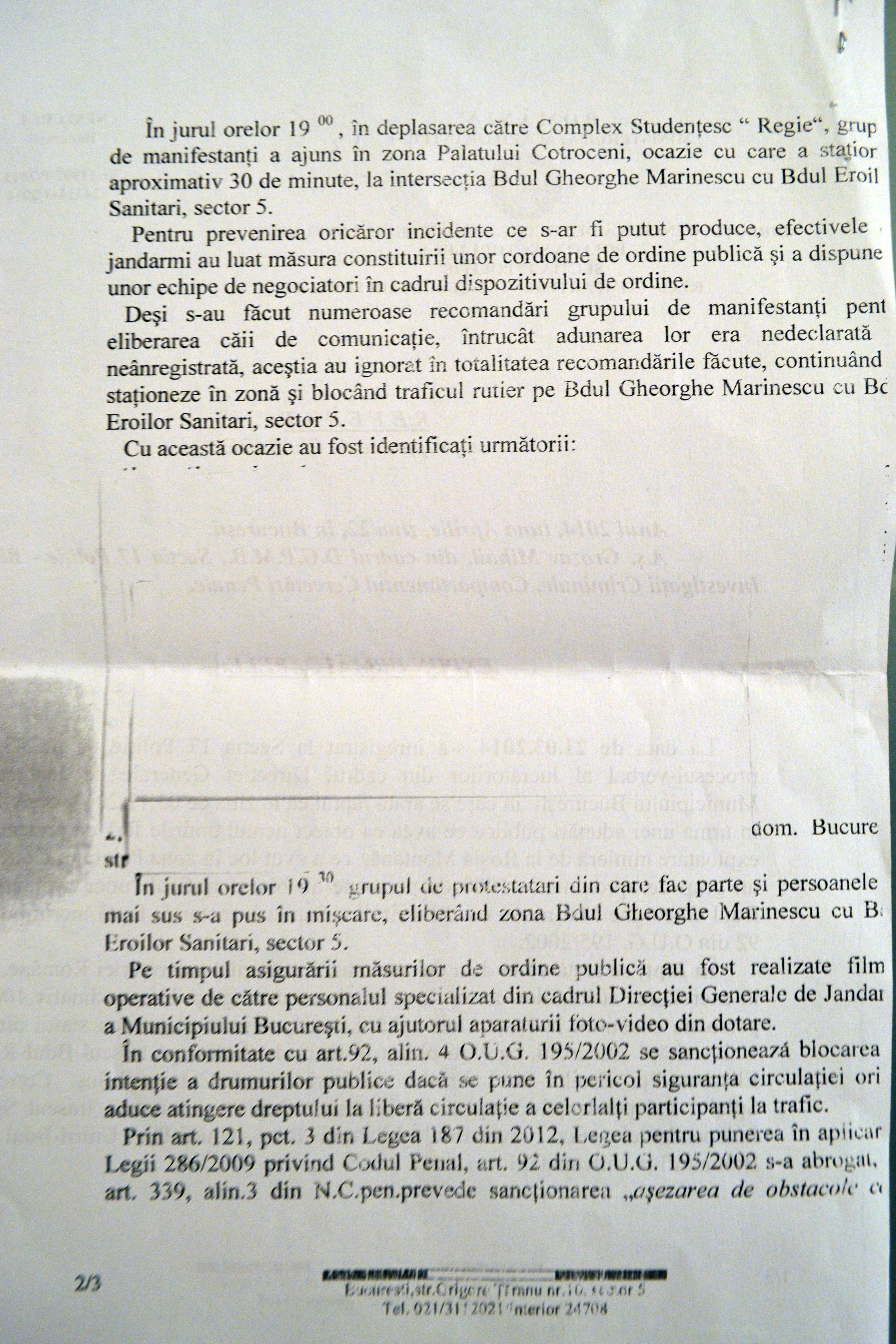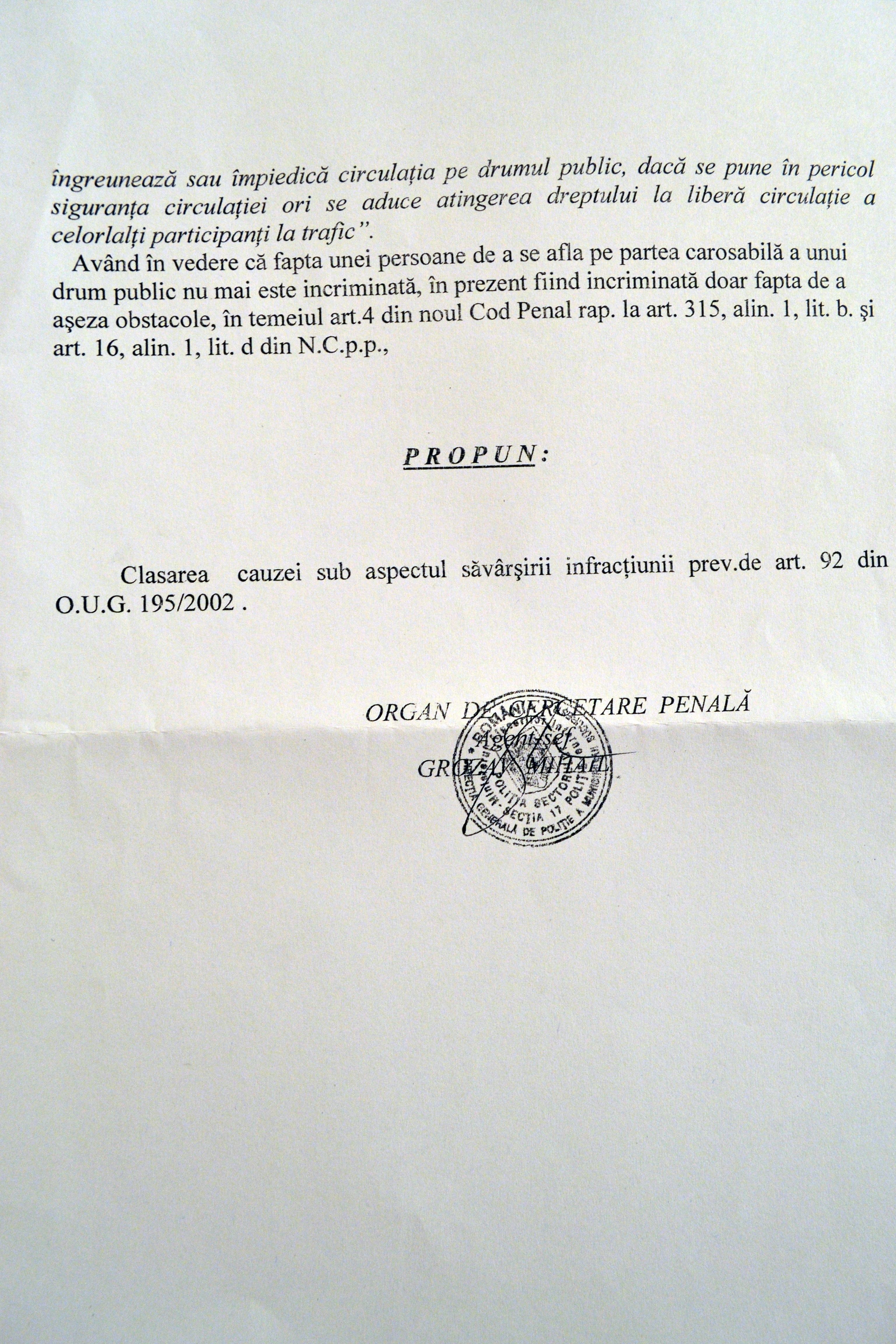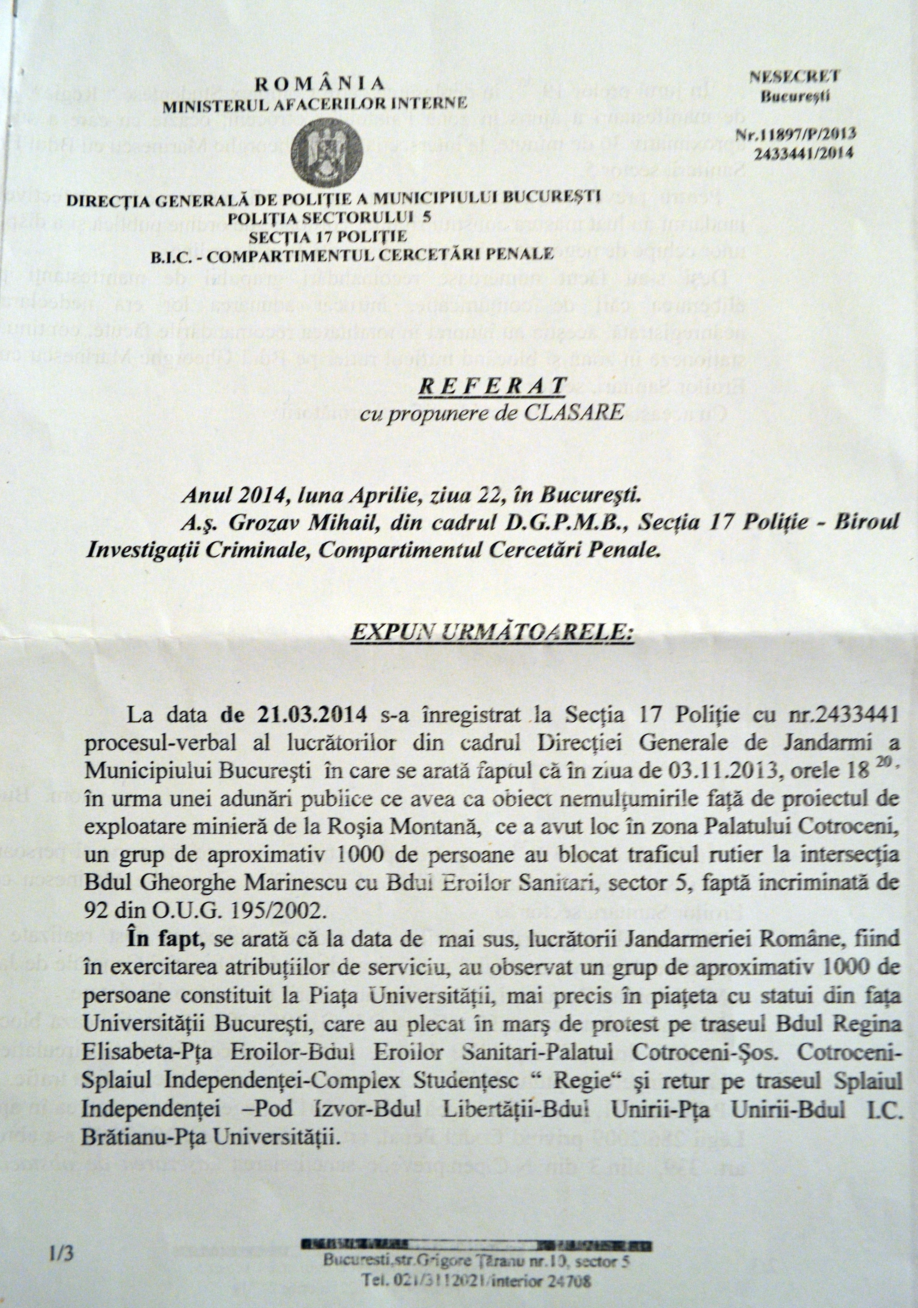 Mi se aduce la cunoștință faptul că în data de 3 noiembrie 2013, în jurul orelor 18.20, în timpul unei adunări publice ce contesta vehement proiectul minier de la Roșia Montană, am blocat intersecția străzilor Bdul. Gheorghe Marinescu cu Bdul. Eroilor Sanitari, alături de alte aproximativ 999 de persoane, unde am staționat alte aproximativ 30 de minute. Având în vedere cele sesizate, Jandarmeria Română a cerut să fiu cercetat penal pentru această infracțiune. Serviciile lucrează iar băieții cu ochii albaștri nu au pauză. În cele din urmă, dosarul s-a clasat pentru că a intrat în vigoare noul cod penal.
