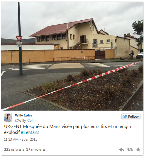 Mai multe grenade de exercitiu au fost aruncate in noaptea de miercuri spre joi in directia unei moschei din Sablon, in Mans (nord-vestul Frantei), relateaza Ouest France. Una dintre grenade a explodat, fara a provoca victime. Atacul nu a fost revendicat pana la aceasta ora. Incidentul intervine in contextul atacului armat de miercuri asupra redactiei Charlie Hebdo, soldat cu 12 morti, urmat de mai multe atacuri armate produse in apropierea unor moschei.