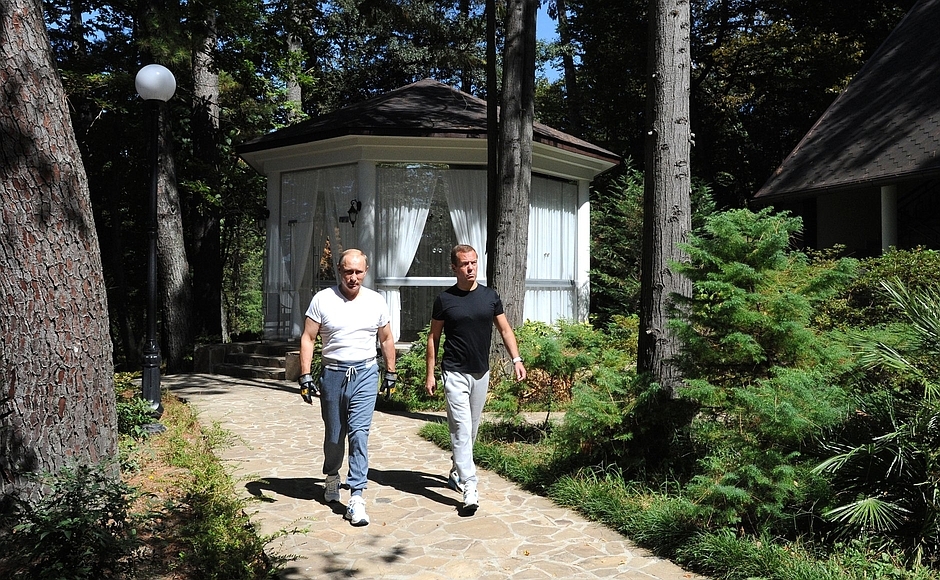 Dupa exercitiile la sala, care au fost facute la resedinta lui Putin de la Marea Neagra, Bociarov Rucei, in apropiere de Soci, cei doi politicieni au fost aratati la televizor facand gratar si band ceai, pentru a intari imaginea de lider sanatos si viguros.