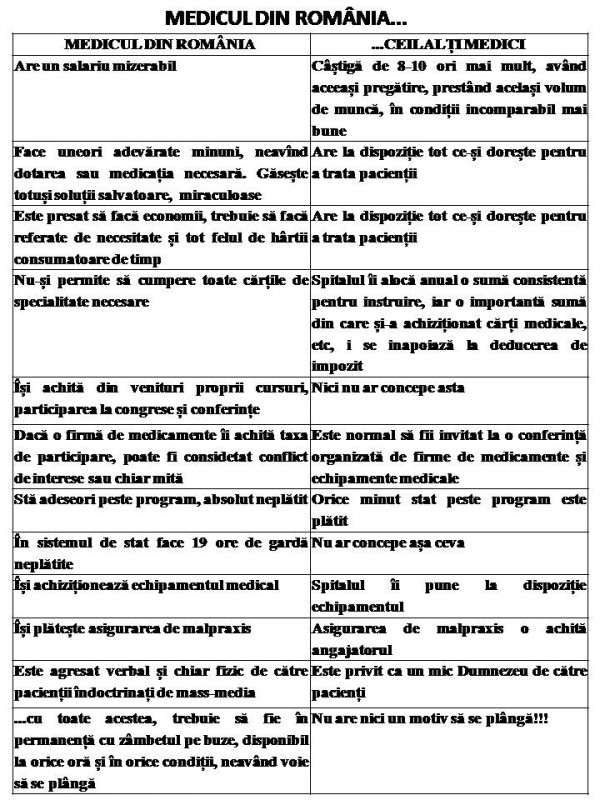 – Nu vrem șpagă! vrem ca societatea să recunoască eforturile noastre și să le recompenseze după merit ! nu am ales cariera medicală cu gândul la șpagă, ci pentru a salva vieți și pentru aceasta am făcut și facem sacrificii, de care nu ne plângem, pentru că nimic nu se compară cu satisfacțiile oferite de salvarea de vieți !