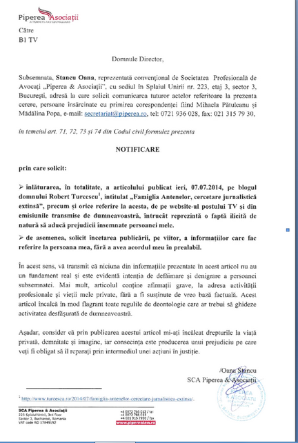 Acum doua zile am primit la sediul B1 TV o notificare din partea numitei Oanei Stancu (Antena 3) in legatura cu articolul de AICI. Pentru inceput, reproduc intocmai notificarea primita, apoi adaug raspunsul subsemnatului.