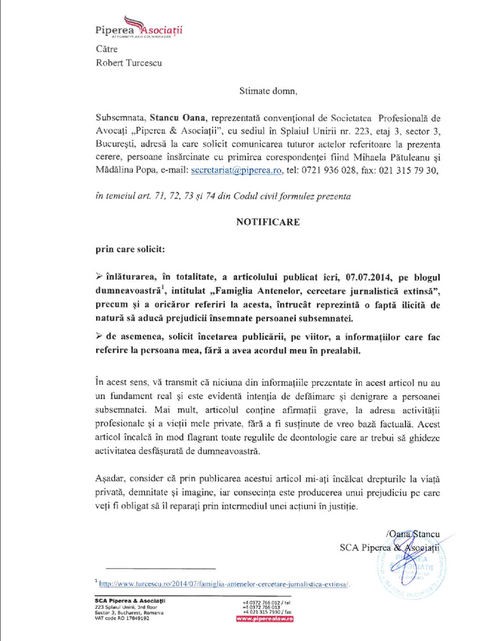 Jurnalistul Robert Turcescu, răspunde pe blogul personal notificării primite din partea Oanei Stancu (Antena 3):
