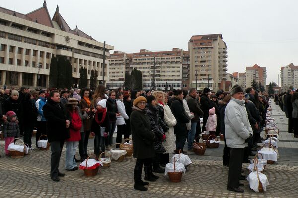 După ora 7.30, oameni din toate colţurile oraşului au venit cu coşurile încărcate cu bucate pascale tradiţionale pe platoul din faţa Palatului Administrativ, în centrul reşedinţei judeţului Harghita, în pofida frigului.