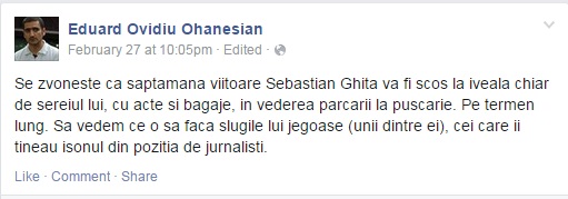 ”Se zvoneste ca saptamana viitoare Sebastian Ghita va fi scos la iveala chiar de sereiul lui, cu acte si bagaje, in vederea parcarii la puscarie. Pe termen lung. Sa vedem ce o sa faca slugile lui jegoase (unii dintre ei), cei care ii tineau isonul din pozitia de jurnalisti”, scrie Ovidiu Ohanesian.