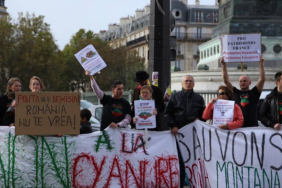 Protestatarii au venit cu afise, megafoane si au scandat: „Non au cyanure, oui a la nature”, „Unis, sauvons, Rosia Montana” sau „UNESCO, reveille-toi, patrimoine pour Rosia”.