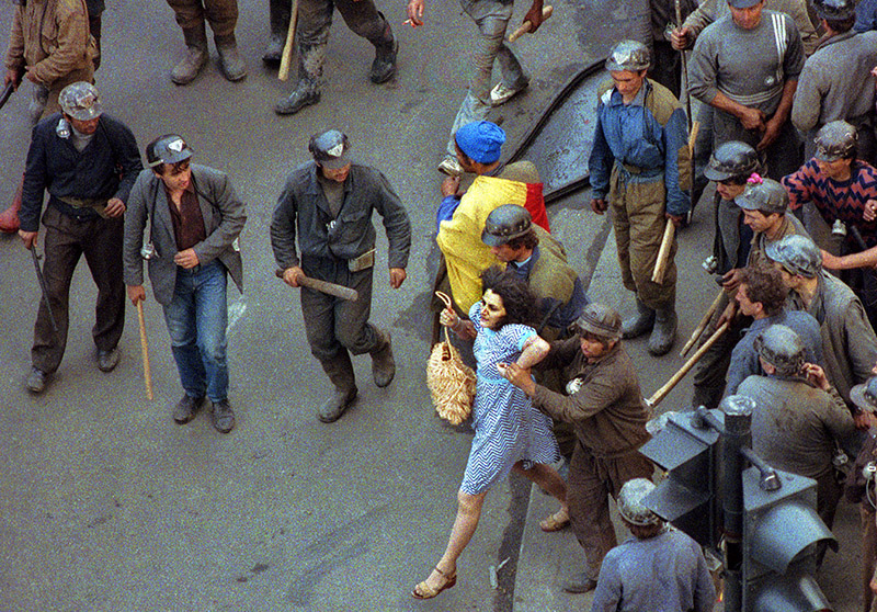 Deja pletele îmi erau năclăite de sânge, cămaşa şi pantalonii la fel, iar un pantof mi se umpluse deja până la gleznă de sânge şi mi se răsucea pe picior, gata-gata să-mi cadă şi dezechilibrându-mă. Un instinct de conservare moştenit încă din copilărie, de când mă băteam cu ţiganii în cartierul de baştină, la Gara de Nord, îmi marcase în minte să evit să ajung pe jos, sub cizmele haidamacilor janghinoşi, dar un fel de leşin şi o greaţă îmi strângea stomacul, capul mi se învârtea, nu-mi mai simţeam corpul, totul era o vâjâitură, vedeam în secvenţe, străfulgerări de metal, bâte, răngi, lanţuri, ciorchinele de carcalaci băloşi şi negri de subteran care fojgăiau în jurul meu mă tot târau prin clădire – nu se mai termina odată oroarea şi chinul. Cred că afară, la stradă, mi s-au epuizat resursele, aveam un fel de blackout-uri, simţeam că îmi plesneşte capul, iar durerea iradia parcă din mine prin toţi porii. Cred că deja abandonasem ideea supravieţuirii, mă gândeam cu ciudă că voi muri ca un prost fără să fi apucat să-i ard şi eu cu trifazicul. Mă târau mai mult pe sus şi deodată au apărut bucureştenii, bucurie mare pe mine, credeam că mă vor scăpa din mâinile hoardei – o mamaie grasă urla ceva la ei, credeam că îi ceartă, ba chiar a smuls o bâtă de la un ciomăgar şi i-a tras cu sete una în cap minerului care (încă) mă ţinea de gât. Victorie, am exclamat în gând, se întoarce roata, poate scap totuşi – m-a fulgerat un gând, minerului îi sărise casca din cap şi mi-a dat drumul. Am căzut la pământ în genunchi şi grăsana a prins să mă scuipe după ce minerul nervos i-a smuls bâta din mâini. I-a ars cucoanei un picior în cur după ce şi-a pus la loc casca şi m-a ridicat de jos de păr.