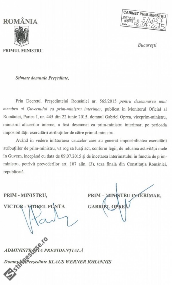 Premierul Victor Ponta s-a aflat în ultima perioadă în Turcia, unde s-a recuperat după o operaţie la genunchi. Din 22 iunie. Gabriel Oprea a ocupat funcţia de premier interimar.