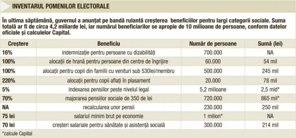 În decurs de câteva zile, premierul şi candidatul la preşedinţie, Victor Ponta, a anunţat o avalanşă de majorări de indemnizaţii, alocaţii şi pensii. Largi categorii sociale urmează să primească sume de câteva zeci sau sute de lei. În total, potrivit calculelor executivului şi estimărilor Capital, efortul pentru buget va fi în jur de un miliard de eruo. Creşterea pensiilor cu 5%, peste nivelul legal, după cum a afirmat prim ministrul, va însemna o suplimentare a bugetului de pensii de 2-2,5 miliarde de lei. În primăvara acestui an, ministrul Muncii, Rovana Plumb, arăta că majorarea nu poate depăşi 4%-4,4%, în cel mai bun caz. Acum, argumentul care stă la baza deciziei este creşterea economică, deşi Institutul Naţional de Statistică a publicat date conform cărora România este în recesiune. Iar contextul internaţional şi intern indică o nouă scădere în al treilea trimestru. „Din fericire, anul acesta am încasat puţin mai mult, asta permite guvernului să păstreze, în primul rând două angajamente fundamentale pe care eu le-am luat ca prim-ministru şi care sunt convins că vor rămâne. Nu se va mai tăia niciodată niciun leu din pensia cuiva, e foarte important, trăim în România unde oamenii ştiu ce au păţit în 2010, se va aplica în fiecare an cel puţin legea care prevede indexarea pe acea metodă cu coeficient de inflaţie şi creşterea salariului mediu“, a declarat Victor Ponta la un post de televiziune.