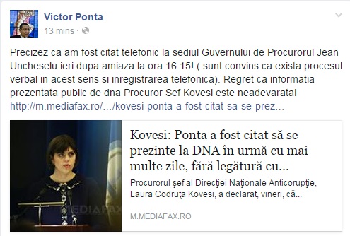 În postarea de pe Facebook, Ponta concluzionează: „Regret ca informația prezentată public de dna Procuror Șef Kovesi este neadevărată!”