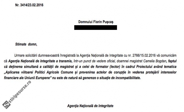 ”Urmare solicitării dumneavoastră înregistrată la Agenția Națională de Integritate cu nr. 2766/15.02.2016 vă comunicăm că Agenția Națională de Integritate a transmis, într-un punct de vedere oficial, doamnei magistrat Camelia Bogdan, faptul că deținerea simultană a calității de magistrat și a celei de formator (lector) în cadrul Proiectului având tematica „Aplicarea viitoarei Politici Agricole Comune și prevenirea actelor de corupție în vederea protejării intereselor financiare ale Uniunii Europene” nu este de natură să genereze o situație de incompatibilitate.”, susține ANI într-un punct de vedere remis STIRIPESURSE.RO.