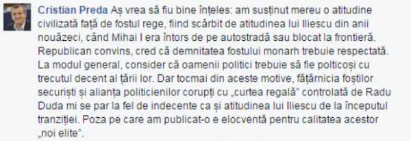 „Aș vrea să fiu bine înțeles: am susținut mereu o atitudine civilizată față de fostul rege, fiind scârbit de atitudinea lui Iliescu din anii nouăzeci, când Mihai I era întors de pe autostradă sau blocat la frontieră. Republican convins, cred că demnitatea fostului monarh trebuie respectată. La modul general, consider că oamenii politici trebuie să fie polticoși cu trecutul decent al țării lor. Dar tocmai din aceste motive, fățărnicia foștilor securiști și alianța politicienilor corupți cu ‘curtea regală’ controlată de Radu Duda mi se par la fel de indecente ca și atitudinea lui Iliescu de la începutul tranziției. Poza pe care am publicat-o e elocventă pentru calitatea acestor ‘noi elite'”, a mai scris Preda.