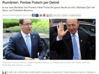 „Puci prin decret”, titreaza un alt cotidian din Austria, Der Kurier, amtintind ca, in doar doua luni, premierul Victor Ponta a reusit sa concentreze intreaga putere: „Urmatorul obiectiv: demiterea presedintelui Traian Basescu”.