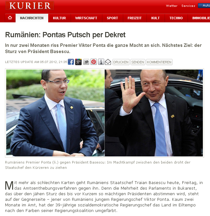 „Intelectualii romani critica razboiul inceput fata de institutiile statului si il acuza pe Ponta de puci. Intre timp, Europa ameninta Romania cu declansarea procedurii de suspendare a dreptului de vot in cadrul Consiliului European (…) Au fost schimbati Avocatul Poporului, sefii de la televiziunea si radioul publice, presedintii Camerei Deputatilor si Senatului. Ca seful statului sa fie demis, Guvernul lui Ponta a limitat atributiile Curtii Constitutionale a Romaniei”, potrivit celor de la Der Kurier.