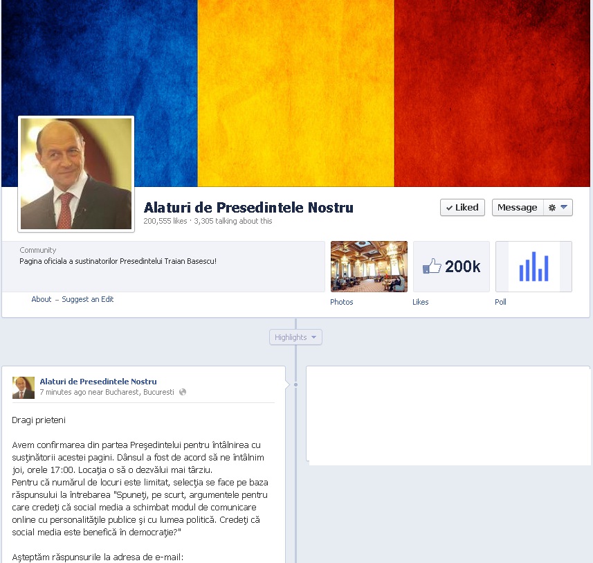 „Pentru noi, sustinatorii Presedintelui, Facebook a fost locul in care am putut comunica direct, fara presiuni si interventii. Poate a venit timpul sa ne vedem si fata in fata, ce spuneti? Cum suna o intalnire cu domnul Traian Basescu in care sa vorbim despre rolul Internetului si al social media in comunicarea directa si nemijlocita? Oare dansul ar vrea?”, se arata pe pagina de Facebook.