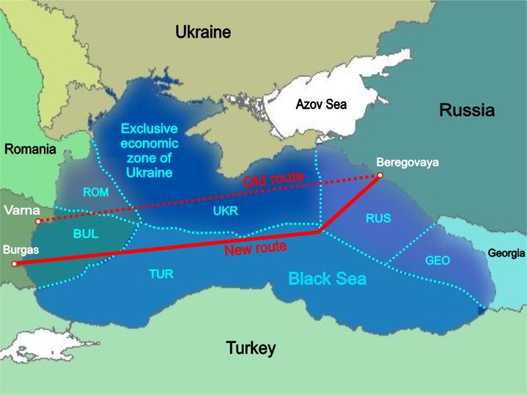 De asemenea, Rusia a plănuit să lanseze South Stream, oconductă menită să transporte gaze naturale ruseşti prin Marea Neagră către Bulgaria, Grecia, Italia şi Austria. Construcţia acesteia a început în decembrie 2012; primele livrări au fost programate pentru sfârşitul anului 2015. A fost plănuită evitarea zonei exclusive economice (Curba Tuapse) sau a platformei continentale ucrainene. Această extindere a rutei submarine cu aproximativ 100km adaugă 1,3-1,5 miliarde de dolari la costurile proiectului, fără a menţiona creşterea consturilor de întreţinere pe viitor. Este demn de notat faptul că noua rută a South Stream trece prin zona economică exclusivă a Turciei. Turcia este membră NATO şi ar putea fi interesată de proiecte alternative pentru construirea de conducte de gaze precum şi de alte aspecte în zona menţionată care să contravină intereselor Rusiei.