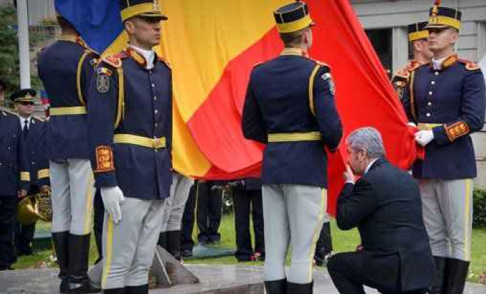 dusa a injanuchiat teatral si a sarutat panza tricolorului. mai demn, ghinararul numai s’a inclinat…
