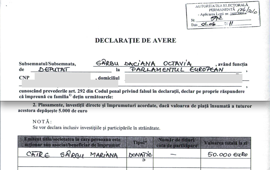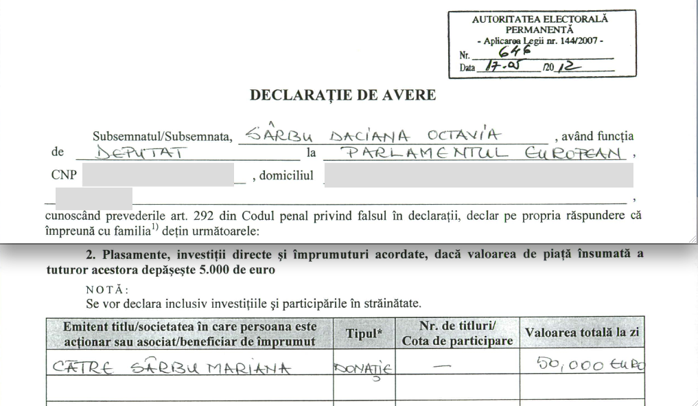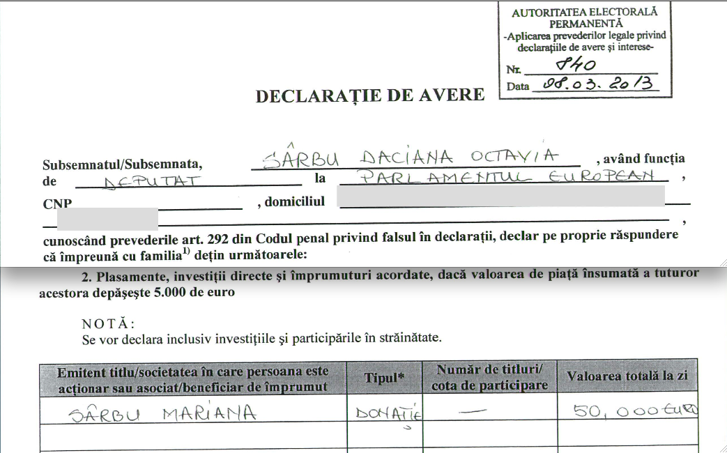 Anual, cea mai anostă lipitoare politică din România promovată prin nepotism cîștigă 72.000 de euro. Cel puțin așa scrie în declarația ei de avere, în fiecare an, duamna Daciana. Și tot în fiecare an, duamna Daciana mai scrie în declarația de avere că donează 50.000 de euro propriei mame, duamna Mariana (Sârbu), nevasta monocotiledonatului Ilie (Sârbu).