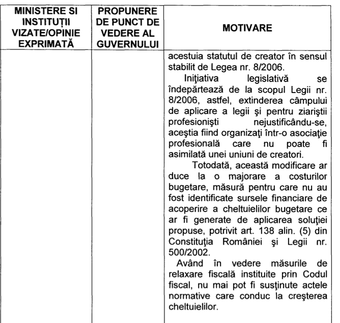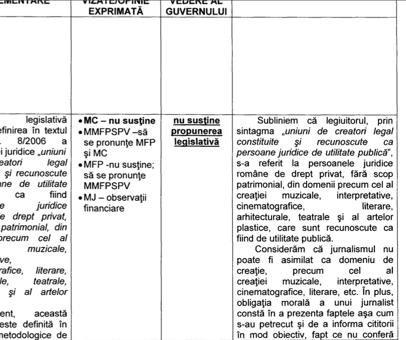 Așadar, inspirație plus academism egal inițiativă legislativă și pac cu ea și la Guvern, să-și dea cu părerea. În ciuda numărului mare de semnături strînse de Vochițoiu în special de la colegii din UNPR pentru acest proiect de lege, Guvernul a zis așa (vezi mai jos): “Ministerul Culturii – nu susține; Ministerul Muncii – să se pronunțe Ministerul de Finanțe și Ministerul Culturii; Ministerul de Finanțe – nu susține, să se pronunțe Ministerul Muncii; Ministerul Justiției – observații financiare”.