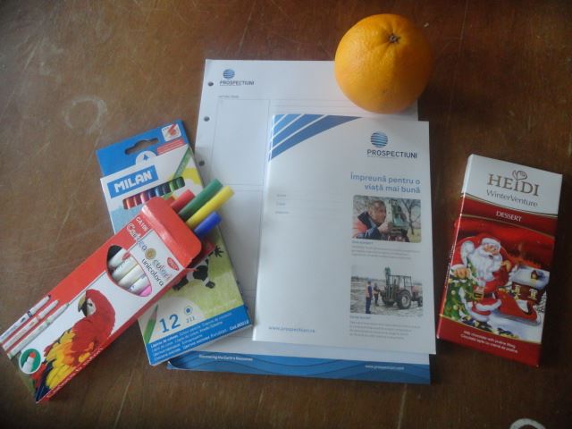 Firma Prospectiuni S.A. a impartit de Mos Nicolae caiete, blocuri de desen, carioci, creioane dulciuri si o portocala elevilor Scolii Generala din Mosna „Stephan Ludwig Roth”.