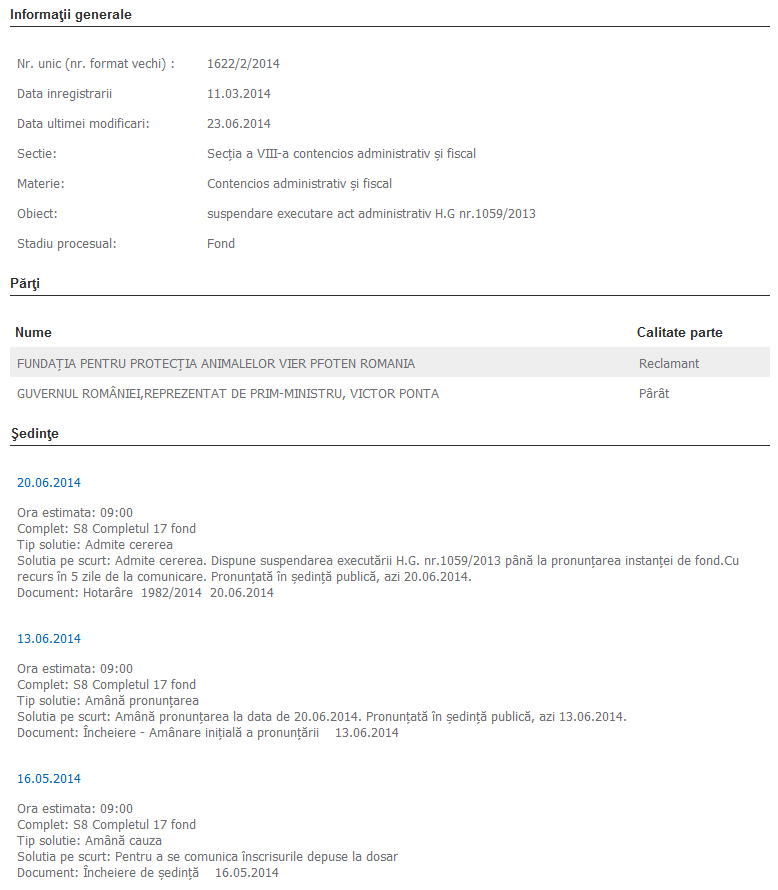 „Curtea de Apel Bucureşti (CAB) a pronunţat vineri decizia în favoarea organizaţiei internaţionale Vier Pfoten, suspendând normele de aplicare a legii care permite uciderea câinilor fără stăpân”, se arată într-un comunicat al Vier Pfoten remis luni.