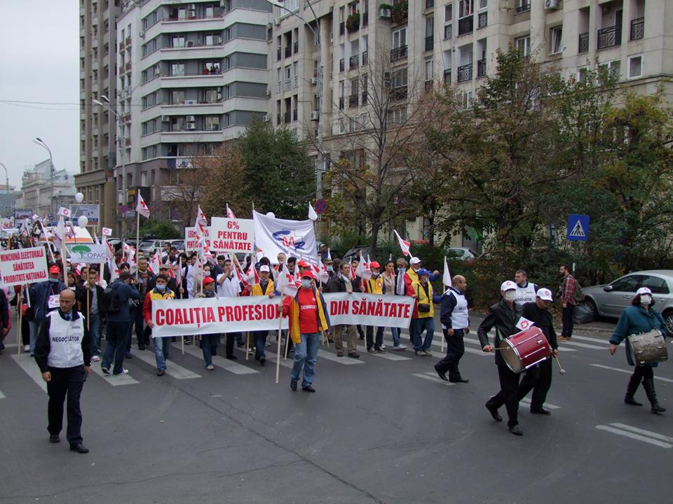 Aproximativ 10.000 de sindicalisti Sanitas din toata tara au iesit in strada, sambata, 2 noiembrie, nemultumiti de conditile si salarile din sistemul de sanatate. Din solidaritate cu angajatii sistemului de sanatate, la protest s-au prezentat si cativa dintre contestatarii proiectului de la Rosia Montana. Acestia au fost inlaturati de catre jandarmi chiar daca s-au prezentat la protest la invitatia Sanitas Bucuresti.
