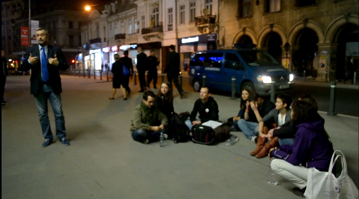 Ei s-au asezat pe trotuar in fata geamului de la NASUL si au scandat impotriva proiectului minier de la Rosia Montana. Dupa doar cateva minute si-a facut aparitia Politia si o duba de Jandarmerie si au fost legitimati.