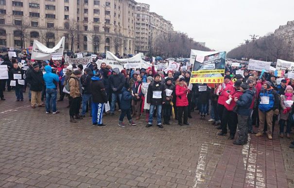 Mitingul, organizat de Grupul Clienţilor cu Credite în CHF (cu circa 16.000 de membri) pe reţeaua de socializare Facebook, a reunit români din multe zone ale ţării, care au venit împreună cu familia, copiii şi prietenii, de la Bacău, Brăila, Constanţa, Cluj, Sfântu Gheorghe, Harghita, Tulcea, Baia Mare, Slatina, Piteşti, Timişoara, Oradea, Iaşi, Turda sau Galaţi.