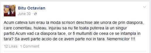„Acum cateva luni erau la moda scrisori deschise ale unora de prin diaspora, care comentau, huleau, injurau sa nu fie toata puterea la un singur partid. Acum vad ca diaspora tace, or fi multumiti de ceea ce se intampla in tara? Sa aveti parte acolo de ce avem parte noi in tara. Nemernicilor !!!”, scria Bitu in luna iunie.